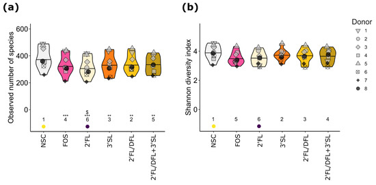 To assess the effect of HMOs and FOS on alpha diversity (diversity within a community), the observed number of species (richness) and the Shannon diversity index (function of evenness and richness) were evaluated at 24 h. In general, HMO and FOS treatments significantly (padjusted ≤ 0.01) decreased richness when compared with the NSC (Figure 3a). Microbiota treated with 2′FL resulted in significantly (padjusted = 0.025) lower species richness than microbiota treated with FOS. Richness for 3′SL, 2′FL/DFL, and 2′FL/DFL + 3′SL treatments did not differ significantly (padjusted > 0.05) from FOS. There was, however, no significant difference in Shannon diversity between HMO and FOS treatments and the NSC (Figure 3b).