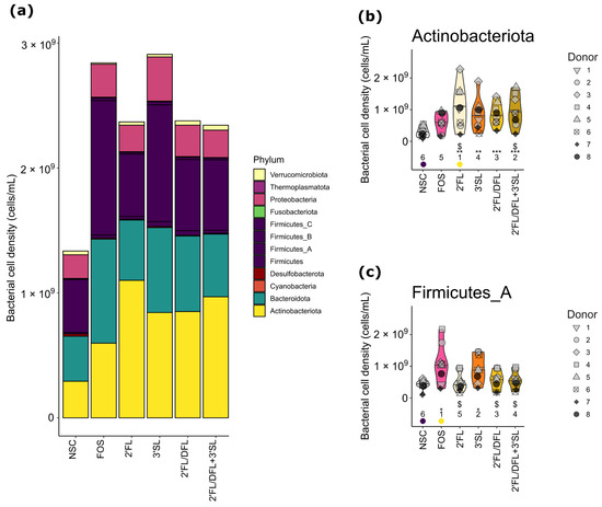 Impact of HMOs and HMO blends on composition, at phylum level, of pIBD fecal microbiota. (a) Bar plot of mean absolute abundance of different phyla. Violin plots of absolute abundance of (b) Actinobacteriota and (c) Firmicutes_A. Violin plots depict mean and individual microbiota values for each donor (n = 8). The ranks of mean values per treatment are indicated at the bottom of the figure, with the lowest average being indicated in purple and the highest value in yellow. Significant effects between NSC and treatments are depicted with * (padjusted ≤ 0.05), ** (padjusted ≤ 0.01), and *** (padjusted ≤ 0.001). Significant effects between FOS and treatments are depicted with $ (padjusted ≤ 0.05).