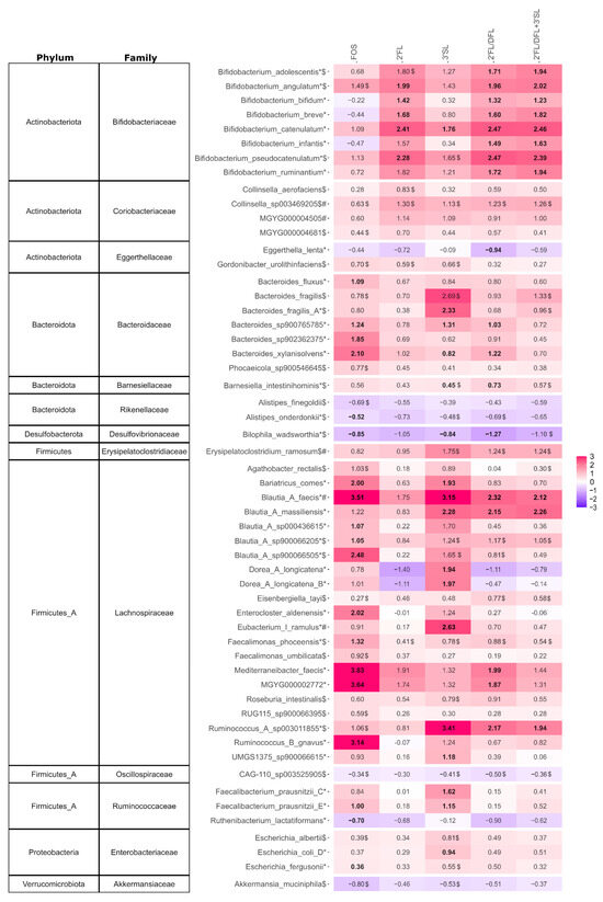 Impact of HMOs and HMO blends on the composition at species level of pIBD fecal microbiota. Heatmap of geometric mean of log2 fold changes against the NSC. Only species that were significantly (padjusted ≤ 0.05, indicated by *) or consistently (consistent but non-significant change in all donors (minimum four) where species are detected, indicated by $) affected by any treatment or being among the top 5 taxa explaining overall variation in the dataset based on PCA (indicated by #) were included. The analysis is based on the 150 most abundant species. Log2 fold changes that are significant are indicated in bold.