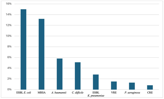 The median prevalence of the most common MDROs in the elderly can be concluded from a recent study with data from long-term care facilities worldwide, as illustrated in Figure 1. This study revealed that extended-spectrum beta-lactamase (ESBL)-producing Enterobacteriaceae have the highest median prevalence at 11.6%, with E. coli contributing 15.0% and K. pneumoniae 2.9%. MRSA follows closely with a median prevalence of 13.2%, while Clostridioides difficile accounts for 5.1%. Multidrug-resistant (MDR) A. baumannii stands at 5.8%, and VRE is has a median prevalence of 1.5%. Carbapenem-resistant Enterobacteriaceae (CRE) has a median prevalence of 0.8%, while MDR P. aeruginosa stands at 1.3% [10].