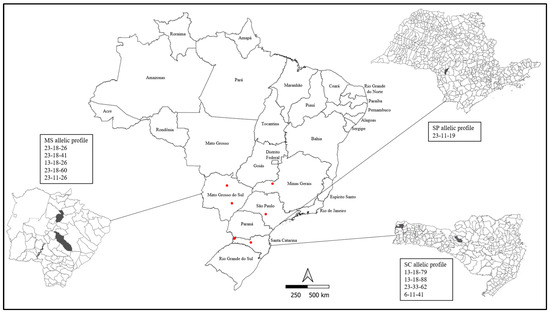 Geographical distribution of batches sampled on a Brazilian map. Red dots represent the farms’ cities. The allelic profile of M. hyopneunoniae from three states was evaluated. SC = Santa Catarina; MS = Mato Grosso do Sul; SP = São Paulo. The area marked in black in each state indicates the city from which the herds originated. Figure created using QGIS software version 3.4.5.