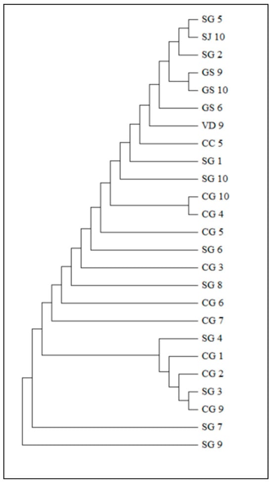 When these alleles were combined (with respect to the order of description of the target genes: adk, rpoB and tpiA), 10 different allelic profiles were observed as described in Table 1. The allelic profiles found did not correspond to any sequence type already reported in the public database. Figure 3 shows the phylogenetic tree based on the sequence of the concatenated genes. The tree can be divided into 16 clades. Shorter branches were observed in the relationship between CG 9 and SG 7 as well as CG 1 and SG 4. These samples originated from the same producing state (Mato Grosso). However, sequences SG 5 and SJ 10 formed an extremely close pair, suggesting a high degree of similarity, even though their geographical origins are far apart.
