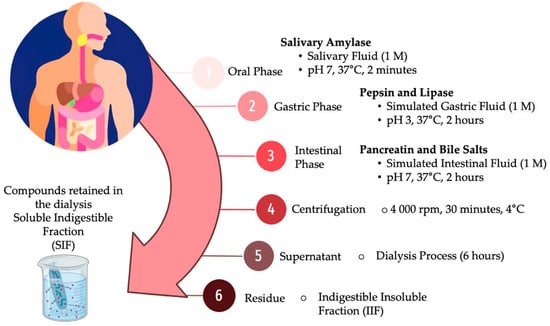 The dehydrated treatments were subjected to an in vitro gastrointestinal digestion model, adapted from the standardized methodology by the INFOGEST international network [], coupled with a dialysis process to estimate the bioaccessibility percentage of phenolic compounds (Figure 1). In the oral phase, 1 g of the sample was incubated under constant agitation with salivary amylase (10 mg/mL, A1031, Sigma-Aldrich, Burlington, MA, USA) and simulated salivary fluid (1 M, pH 7, 37 °C, 2 min). The product from this stage was then kept under constant agitation during the gastric phase by adding pepsin (30 mg/mL, P7000, Sigma-Aldrich, Burlington, MA, USA) and lipase (100 mg/mL, L-3126, Sigma-Aldrich, Burlington, MA, USA) in simulated gastric fluid, adjusting the pH to 3 (1 M, pH 3, 37 °C) for 2 h. To digest proteins, lipids, and starch, the gastric chyme was adjusted to a pH of 7 and subjected to third enzymatic hydrolysis under constant agitation by adding pancreatin (134 mg/mL, P-1750, Sigma-Aldrich, Burlington, MA, USA) and bile salts (200 mg/mL, B-8631, Sigma-Aldrich, Burlington, MA, USA) in simulated intestinal fluid (1 M, pH 7, 37 °C) for 2 h to simulate the intestinal phase. After this period, the hydrolyzed sample was designated as the intestinal fraction (IF). The IF was centrifuged (30 min, 4 °C, 4000 rpm) to obtain two fractions: the soluble indigestible fraction (SIF), corresponding to the supernatant, and the insoluble indigestible fraction (IIF), corresponding to the precipitate. The IIF was washed twice with distilled water (5 mL), and the supernatants were combined with the SIF to a determined volume (50 mL). The SIF was subjected to a dialysis process in an aqueous medium using a dialysis membrane (6 h, 12–14 KDa, Sigma-Aldrich, D9652).