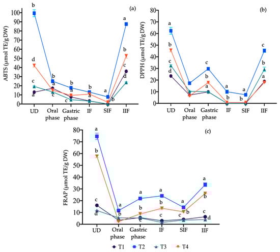 Changes in antioxidant capacity by (a) ABTS, (b) DPPH, and (c) FRAP methods during in vitro gastrointestinal digestion. Different lowercase letters in each column indicate significant differences between treatments (p < 0.05). T1—control; T2—mango seed extract at 7 mg/mL; T3—106 cell/mL of P. acidilactici; T4—combination (50:50 v/v) of mango seed extract at 7 mg/mL and 106 cell/mL of P. acidilactici. UD, undigested; IF, intestinal fraction; SIF, soluble indigestible fraction; IIF, insoluble indigestible fraction.