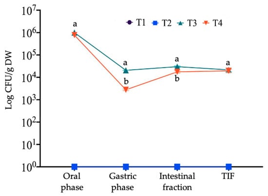 In the intestinal fraction, P. acidilactici content stabilized at 104 log of CFU/g in both treatments; however, T3 showed a slightly higher concentration (p < 0.05). In this stage, the physiological conditions shift to a less acidic environment, promoting bacterial stability. Additionally, the compounds that were hydrolyzed and released can act as carbon sources to improve the metabolism, viability, and multiplication of the bacteria, as observed in T4 with an increase of one logarithm in bacterial concentration []. Regarding the total indigestible fraction (TIF), the concentration remained stable at 104 log of CFU/g in both treatments, with no statistical differences (p > 0.05). Within this fraction, probiotic bacteria can access a wide range of carbon sources, which they can utilize when the fermentation process begins. It is important to note that the final concentration for both treatments is above 104 log of CFU/g of food, being close to the minimum concentration of potential probiotic effect [,]