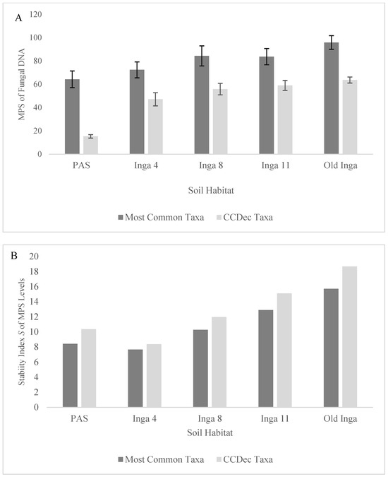 Differences in the MPS of the DNA sequences and the Stability S index of the Most Common Fungal taxa (subset of Total Fungi with MPS > 1.0%) and the Complex C Decomposer (CCDec) taxa within soils of 4-year-old, 8-year-old, 11-year-old, and old secondary I. punctata trees (Inga 4, 8, and 11 and Old Inga) and an adjacent pasture (PAS) within a reforestation site in Monteverde, Costa Rica. (A) shows the MPS of the DNA sequences and (B) shows the Stability S index for the two communities.