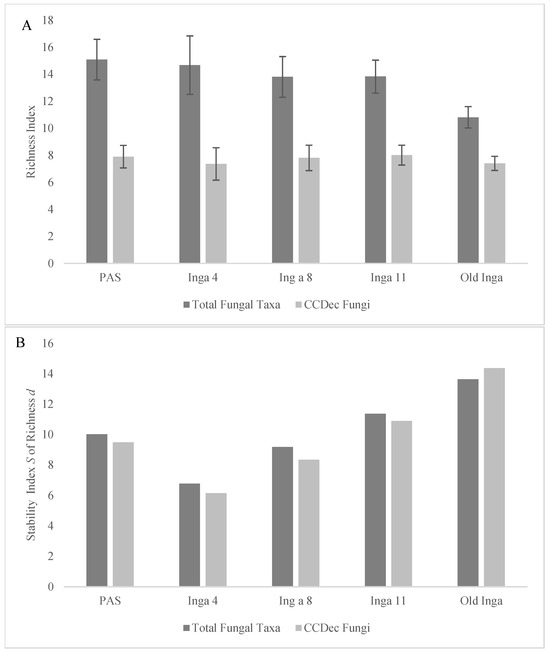 Analysis of the Margalef’s richness index d (± standard deviations) and the Stability S index of the richness d index for the community compositions of the Total Fungi and the Most Common Fungi within soils of 4-year-old, 8-year-old, 11-year-old, and old secondary I. punctata trees (Inga 4, 8, and 11 and Old Inga) and an adjacent pasture (PAS) within a reforestation site in Monteverde, Costa Rica. (A) shows the Margalef’s richness and (B) shows the Stability S index for the two communities.