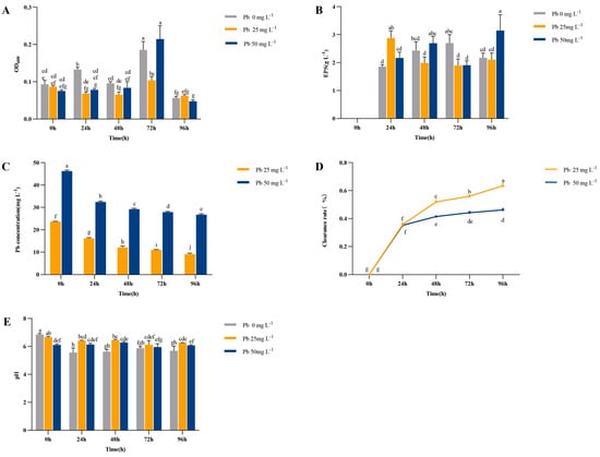 The cell number (indicated by OD600) (A), EPS (B), Pb (C), content clearance rate of Pb (D), and PH (E) in the culture solution at different Pb concentrations inoculated with HZ. Each bar represents the mean ± SD (n = 4). The same letter indicates that there were no significant differences between all treatments (p > 0.05).