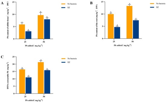 As the concentration of Pb in the soil increased, the Pb content in pakchoi also increased. However, inoculation with strain HZ notably decreased Pb levels in the edible tissues by 17.52–47.48% (Figure 2A) and root Pb content by 43.82–52.83% (Figure 2B). Furthermore, the introduction of HZ led to a significant decrease in the bioavailable Pb content in the soil when compared to the control group, The effective Pb content in the two treatment groups, Pb 25 mg kg−1 and Pb 50 mg kg−1, was reduced by 32.82% and 25.53%, respectively (Figure 2C).