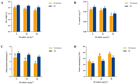 Cabbage biomass gradually decreased with increasing Pb content (Figure 3A). In soils treated with low and high Pb concentrations, cabbage biomass decreased by 5.97% and 11.94%, respectively, compared to the control. The application of strain HZ increased cabbage biomass by 9.45% to 14.69%. Vitamin C (Vc) content and soluble protein content decreased with increasing Pb concentration, and HZ was able to increase the Vc content of cabbage edible tissues (Figure 3B) and soluble protein (Figure 3C). Specifically, at Pb concentrations of 0 mg kg−1, 25 mg kg−1, and 50 mg kg−1, Vc content increased by 11.44%, 9.69%, and 12.92%, respectively (Figure 3C). Soluble protein content increased by 22.58%, 37.55%, and 49.7%, respectively, compared to the control group. Nitrite content increased with increasing Pb concentration in the soil (Figure 3D), and the application of strain HZ significantly reduced the nitrite content by 12.5% to 24.14%.