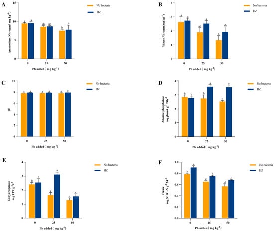 The effects of strain HZ on nitrogen content and pH in the soil around the roots are depicted in Figure 4. Irrespective of the presence of strain HZ, the NH4+ -N and NO3− -N levels in the soil exhibited a declining pattern as the Pb concentration in the soil increased. However, the introduction of strain HZ resulted in an enhancement of the soil nitrogen content (Figure 4A,B). In comparison to the control group, inoculation with strain HZ resulted in a significant increase in NO3− -N content by 14.89%, 32.75%, and 44.26%, respectively, with a greater increase observed at higher Pb concentrations. Additionally, soil pH increased after inoculation with strain HZ (Figure 4C). The effect of strain HZ on inter-root soil enzyme activities is shown in Figure 5. In the absence of strain HZ, there was no significant difference in soil alkaline phosphatase activity between Pb-contaminated and non-Pb-contaminated soils. However, the application of strain HZ to Pb-contaminated soil significantly increased the alkaline phosphatase content by 30.08% to 39.97%. Furthermore, dehydrogenase and urease activities in the inter-root soil decreased significantly with increasing soil Pb content in the absence of strain HZ. After inoculation with HZ, dehydrogenase activity increased by 5.35% to 89.68%, and urease activity increased by 15.06% to 19.88%, compared to the control group. Particularly noteworthy is the extremely significant increase in dehydrogenase activity (up to 89.68%) observed in the Pb 25 mg kg −1 treatment group following the addition of HZ.