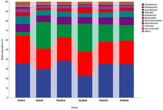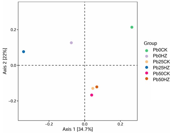 The alpha diversity results are presented in Table 2. The good coverage of all samples reached more than 97%, indicating that the sequencing depth could reflect the microbial community structure more accurately. The effect of Pb application on the bacterial alpha diversity of inter-root soils was not significant, and in the inter-root soils at high content (Pb 50 mg kg−1), all indices of the applied strain HZ (Chao1, Shannon, Simpson, and Observed species) were significantly higher than those of the control, indicating that inoculation of HZ at the level of Pb 50 mg kg−1 increased the total number of species in the community, the diversity of the community, the diversity of the distribution of species within the community, and the evenness. The bacterial alpha diversity indices in the inter-root soil were lower than those in the control group at both Pb 0 mg kg−1 and Pb 25 mg kg−1, which indicated that inoculation of HZ at the levels of Pb 0 mg kg−1 and Pb 25 mg kg−1 decreased the inter-root microbial community structure of Brassica napus. This indicates that inoculation with HZ at the levels of Pb 0 mg kg−1 and Pb 25 mg kg−1 reduced the total number of community species, community diversity, diversity, and evenness of species distribution within the community.
