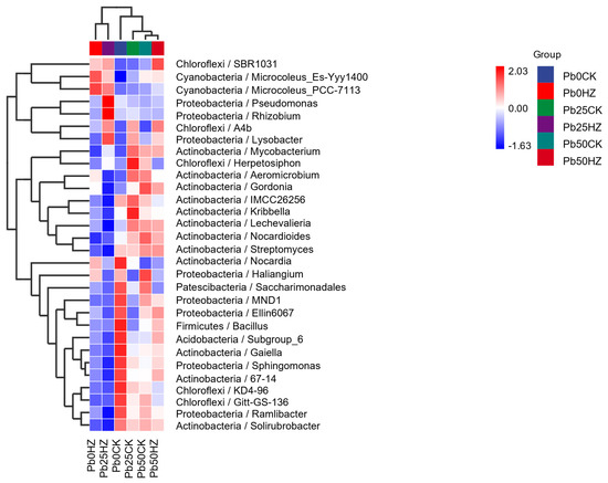 Heat maps of the top 30 genera of rhizosphere soil under different Pb pollution.