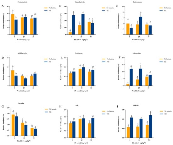 Figure 7 illustrates the thermogram depicting the species composition of the top 30 phyla in the inter-root soil of pakchoi under varying Pb concentrations (Figure 7). In the absence of applied strains, the Pb-contaminated soil compared to the uncontaminated soil, Latescibacteria, Nitrospirae, Patescibacteria, Verrucomicrobia, BRC1, Acidobacteria, Firmicutes, Rokubacteria, WPS-2, Planctomycetes, Armatimonadetes, Proteobacteria, and Gemmatimonadetes decreased in abundance, and the application of strain HZ increased the abundance Proteobacteria, Cyanobacteria, Bacteroidetes, and Acidobacteria (Figure 8A–D). The changes in the inter-root soil bacterial flora across different treatments at the genus level are shown in the figure (Figure 7 and Figure 8E–I). Dominant genera of soil bacteria in the inter-roots of Chinese cabbage analyzed at the genus level primarily included Microcoleus, Pseudomonas, Rhizobium, Lysobacter, Mycobacterium, Proteobacteria, Mycobacterium, Aeromicrobium, and Bacillus. In addition, HZ can significantly improve Lysobacter, Microcoleus, A4b, and SBR1031 relative abundance. The relative abundance of Nocardia decreased with the increase in Pb concentration, and the relative abundance of Nocardia was significantly lower than that of the control group when strain HZ was applied.