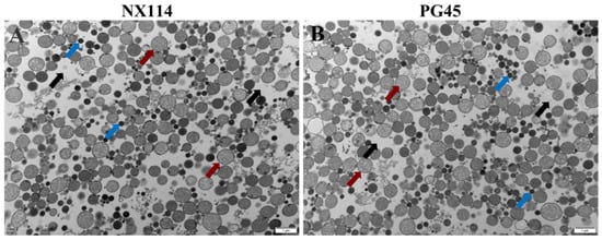 Organelles of M. bovis NX114 vs. PG45 transmission electron microscopy (12,000×). (A) M. bovis NX114. (B) M. bovis PG45. (black arrow: cytoplasm; blue arrow: soluble protein; red arrow: ribosome).