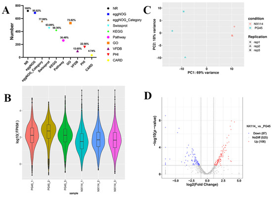 The general pattern of RNA-seq data and the identification of DEGs for M. bovis NX114 vs. PG45. (A) Genomic gene annotation information. (B) FPKM density distribution. (C) PCA analysis. (D) Volcano map of DEGs.