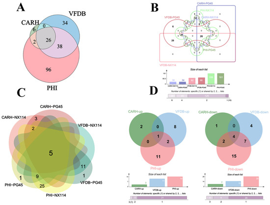 The annotation of the mRNAs of M. bovis NX114 vs. PG45. (A) Equal scale area Venn diagrams of the annotation information of the two strains of M. bovis together at CARH, VFDB and PHI. (B) Interactive Venn plots of the annotation information of the two strains of M. bovis together at CARH, VFDB and PHI. (C) The annotation information of DEGs of M. bovis NX114 vs. PG45. (D) Up- and down-regulated annotation information for DEGs of M. bovis NX114 vs. PG45.
