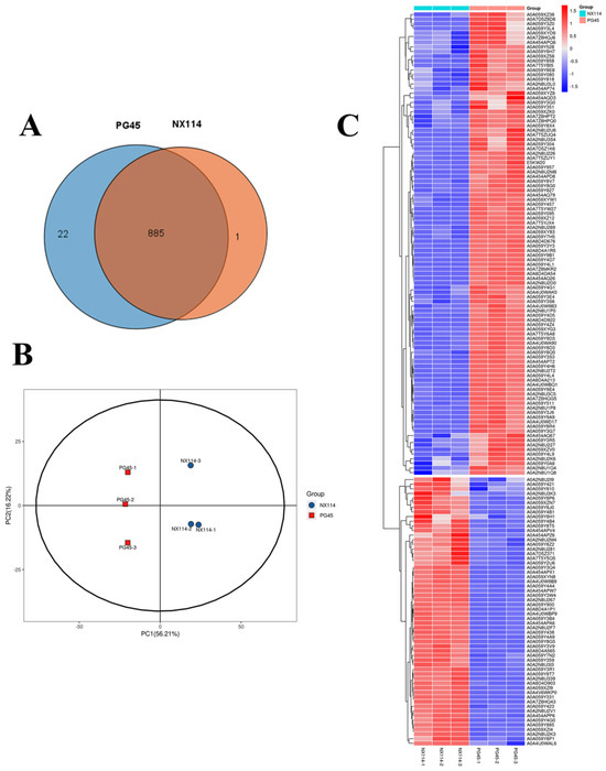 The proteomic analysis of M. bovis NX114 vs. PG45. (A) A Venn diagram of the proteome. (B) A PCA analysis of proteomic profiles. (C) A cluster analysis of DEPs of M. bovis.