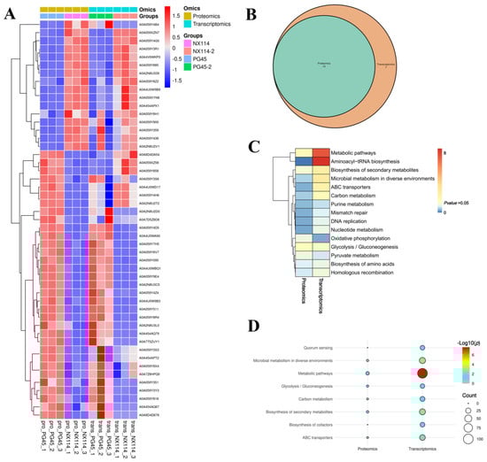 Joint analysis of M. bovis DGPs and DEGs. (A) Shared significant difference gene/protein clustering analysis. (B) KEGG comparison Venn diagram. (C) pvalue_heatmap. (D) Significant KEGG comparison bubble plot.
