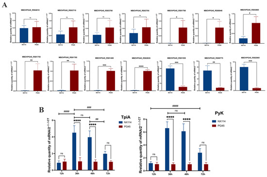The validation of differentially expressed gene expression levels in M. bovis NX114 vs. PG45. (A) The validation of RNA-seq data for randomly selected genes by real-time PCR. * p < 0.05, ** p < 0.01, *** p < 0.001 and **** p < 0.0001 ns (no significance) p > 0.05. (B) qRT-PCR was used to detect the relative mRNA expression of TpiA and PyK genes at different growth stages. ## p < 0.01, ### p < 0.001 and #### p < 0.0001, ns (no significance) p > 0.05.