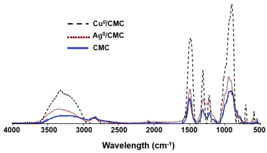 Deeper insights through attenuated total reflectance Fourier transform infrared (ATR-FTIR) analysis showed noticeable and specific changes in the shape and intensity of the large adsorption band in the 3500–3000 cm−1 region (Figure 2), with more intense and sharper bands for Cu0/CMC and Ag0/CMC in comparison with CMC. This suggests lesser hydrogen association (involving -OH groups of the CMC), which are hindered by the presence of MNP/CMC. Higher intensities, sharpness, and minor shifts of the -OH asymmetric stretching bands from 3255 cm−1 for CMC towards higher wavenumbers; i.e., 3343 cm−1 for Cu0/CMC and 3371 cm−1 for Ag0/CMC (Table 1) indicate a slight softening of the -OH bonds, which requires less energy for stretching vibration due to interaction with MNPs. This can be explained by the involvement of the hydroxyl groups of the CMC via the electron pairs of the oxygen atoms. More precisely, the slight band sharpening in the range of 3500–3000 cm−1 seems to be related to the rise in -O:MNP/CMC interaction at the expense of H-bridges. Thus, it appears that the hydroxyl groups are no longer involved in hydrogen binding but are involved in MNP/CMC stabilization.