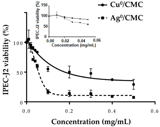 The safety concentration range of Cu0/CMC or Ag0/CMC was evaluated via 3-(4,5-dimethylthiazol-2-yl)-2,5-diphenyl-2H-tetrazolium bromide (MTT) reduction by viable IPEC-J2. Non-infected IPEC-J2 cells were treated with Cu0/CMC or Ag0/CMC at various concentrations in the range of 0–0.50 mg/mL for 24 h (Figure 3). The minimum inhibitory concentration (MIC) of Cu0/CMC and of Ag0/CMC were close to each other: 0.027 ± 0.003 mg/mL and 0.021 ± 0.001 mg/mL, respectively (Figure 3 closeup and Table S1). Differently, the concentration that inhibits the growth of IPEC-J2 at half (IC50) was 0.201 ± 0.013 mg/mL for Cu0/CMC, approximately four times higher than that of 0.052 ± 0.003 mg/mL observed for Ag0/CMC (Table S1). A lower IC50 and MIC for Ag0/CMC compared with those of Cu0/CMC (Figure 3 and closeup) revealed that the cytotoxicity of Ag0/CMC for non-infected IPEC-J2 was higher compared with that of the Cu0/CMC counterpart.