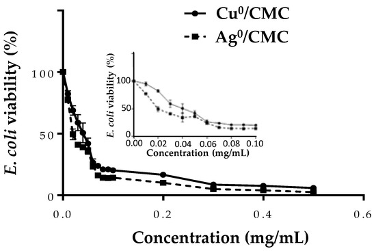 Antibacterial effectiveness, half-maximal effective concentration (IC50), the concentration of Cu0/CMC and of Ag0/CMC that induced a response halfway between the baseline and maximum after a specified exposure time), and the minimal inhibitory concentration (MIC, the lowest concentrations of Cu0/CMC and Ag0/CMC that will inhibit the visible growth of the bacteria) were calculated in order to evaluate Cu0/CMC and Ag0/CMC antibacterial activity.