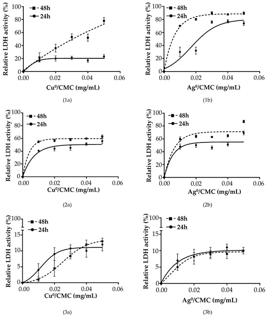 The curve tendency representing the LDH activity of infected cells treated with MNP/CMC is similar at 24 h compared with 48 h of treatment, with an increase phase and a stationary phase, except for Cu0/CMC and Ag0/CMC having an almost constant increase up to 80% LDH activity at 48 h of treatment (Figure 6(1a,2a)).