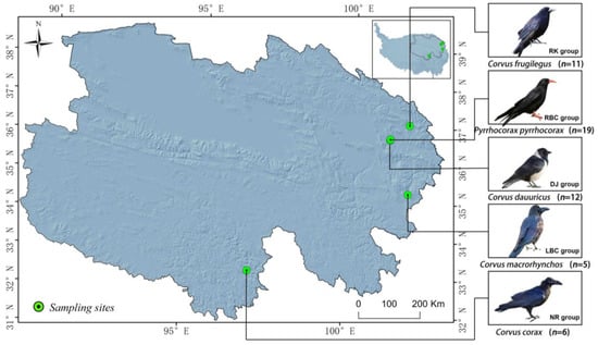 In this study, three species of crows were captured from a local area within the Qinghai Province of China (Figure 1). These crows included Red-billed choughs (Pyrrhocorax pyrrhocorax), Daurian jackdaws (Corvus dauuricus), and Rooks (Corvus frugilegus). A total of 42 individuals were captured and classified into three groups: Red-billed choughs (RBC group, n = 19), Daurian jackdaws (DJ group, n = 12), and Rooks (RK group, n = 11). After transporting the individuals to the laboratory, dissections were performed. The intestines were extracted, and the intestinal contents were squeezed out. All intestinal contents were stored in a freezer at −80 °C until further use. Additionally, fresh fecal samples were collected from two other crow species: Large-billed crows (Corvus macrorhynchos) (labeled as the LBC group, n = 5), and Northern ravens (Corvus corax) (labeled as the NR group, n = 6) (Figure 1). These samples were obtained directly after defecation, in the immediate vicinity of our sampling staff, who then promptly froze them using liquid nitrogen. The samples were subsequently transported to the laboratory and stored at −80 °C for future analysis.