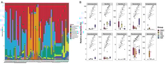 The relative abundance of the three taxonomic ranks, including phylum, genus, and species, in each sample, as well as the differential analysis among various groups, were analyzed. A total of 132 bacterial phyla were detected among the five groups (Table S2). At the phylum level, the overall community profile constituted dominantly Pseudomonadota (54.83%), Bacillota_A (16.64%), Bacillota (8.15%), Actinomycetota (7.54%), Spirochaetota (5.43%), Bacteroidota (3.56%), Campylobacterota (1.56%), Cyanobacteriota (0.56%), Myxococcota (0.49%), and Patescibacteria (0.40%) (Figure 2A). The sum of the sequence proportions of these top seven phyla reached 99.15% of the total sequences. An analysis of variation was conducted on the ten most prominent phyla found across five groups, utilizing the Kruskal–Wallis test. Furthermore, the resulting p-values were adjusted by employing the Benjamini–Hochberg method (Figure 2B). The DJ group showed a significant increase in Campylobacterota and Spirochaetota, while the LBC group had a significant increase in Pseudomonadota and Cyanobacteriota (Figure 2B). The NR group also had a significant increase in Bacteroidota and Actinomycetota, and the RK group contained the highest amount of Bacillota_A (Figure 2B).