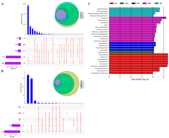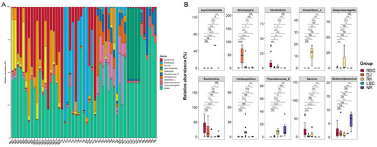 At the genus level, a total of 11,621 bacterial genera were annotated among the five groups (Table S3), and the top 10 genera were presented in Figure 3A. The main genera were Escherichia (18.13%), Brachyspira (12.24%), Sarcina (7.59%), Aquirickettsiella (5.09%), Clostridium (4.03%), Pseudomonas_E (3.15%), Herbaspirillum (2.69%), Clostridium_J (2.53%), Sediminibacterium (2.19%), and Dwaynesavagella (2.06%), which accounted for 59.70% of the relative abundance of all genera. The results of the differential abundance analysis showed that the RBC group had the highest levels of Clostridium, Escherichia, and Sarcina (Figure 3B). The DJ group had the highest content of Brachyspira. The RK group contained the highest amounts of Clostridium_J, Dwaynesavagella, Herbaspirillum, and Pseudomonas_E. The LBC group had the highest content of Aquirickettsiella. The NR group contained the highest amount of Sediminibacterium.