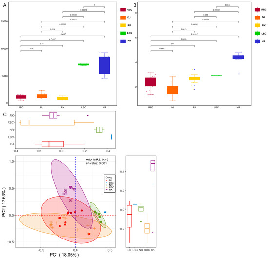 In order to compare the bacterial genera richness and diversity across the five groups, we analyzed the levels of bacterial richness and diversity using two specific methods. The Chao1 estimator was employed to assess bacterial richness, while the Shannon index was utilized to evaluate bacterial diversity. As illustrated in Figure 5A, the LBC and NR groups exhibited the greatest microbial richness among the samples. The Chao1 index, which serves as a measure of microbial richness, ranged from 4601.81 to 9263.37 in these groups. The RK group displayed the lowest microbial richness, with the average Chao1 index standing at 933.19. The Shannon index revealed that the NR group possessed the highest index, with an average Shannon index of 4.26, signifying the greatest bacterial diversity. Conversely, the DJ group exhibited the lowest index, with an average Shannon index of 1.73, as depicted in Figure 5B. The dissimilarity of bacterial genera among samples from five different groups was compared, and principal coordinates analysis (PCoA) based on the Bray–Curtis distance was carried out. The results showed a dispersed distribution of the microbiome across the five groups, indicating significant differences in their composition (Figure 5C).