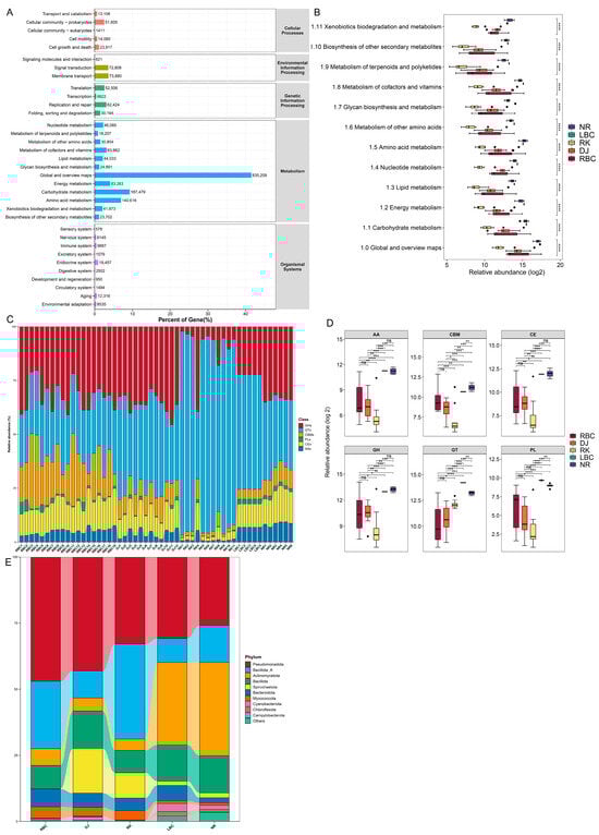 As shown in Figure 6E, the taxonomic classification of putative CAZyme genes in the RBC and RK groups revealed that most sequences were derived from Pseudomonadota and Bacillota_A bacteria, which collectively contributed over 68% of the genes in both groups. In the LBC and NR groups, the taxonomic classification of putative CAZyme genes showed most sequences derived from Pseudomonadota and Actinomycetota, which together comprised over 61% of the genes. In the DJ group, the taxonomic classification of the putative CAZyme genes showed that a significant portion of the sequences were derived from Pseudomonadota and Spirochaetota bacteria. These two bacterial groups contributed over 59% of the genes in the DJ group, highlighting their predominance in terms of potential CAZyme gene contributions.