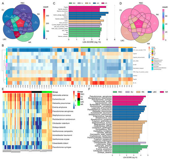Bacterial infections typically involved virulence factors, which were vital for bacterial pathogenicity. The identification of these virulence factor genes (VFGs) was key to the effective treatment and management of severe bacterial infections. In this study, a total of 3607 genes (0.13%) were annotated based on the virulence factor database. The NR group had the highest number of VFGs (2551), followed by the DJ group (463), the LBC group (437), the RBC group (85), and the RK group (71). In this study, 22.24% of the detected VFGs were shared among the five groups (Figure 7A). A total of 43 types of VFGs with 243 subtypes were identified across all samples. Among the top ten virulence factors, the enrichment of VFGs was mainly in offensive VFGs, which was related to the function of motility, secretion systems, and adherence (Figure 7B). The defensive VFGs involved immune evasion, anti-phagocytosis, efflux pump, and iron uptake. The LEfSe analysis indicated that a total of 16 VFGs subtypes (LDA score > 4, p < 0.05) were the key markers among the five groups (Figure 7C).
