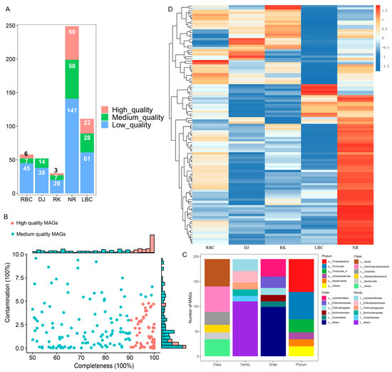 We employed a single-sample assembly approach to reconstruct the microbial genomes from all 53 metagenomic datasets. A total of 500 MAGs were obtained (Figure 8A). The NR group and the LBC group obtained the highest number of MAGs (Figure 8A). Within these groups, 81 MAGs exhibited a completeness rate exceeding 90% (classified as high-quality), which included 18 MAGs that demonstrated a completeness of 100%. A total of 114 MAGs displayed a completeness ranging from 50% to 90% (categorized as medium-quality), while the remaining 305 MAGs exhibited a completeness of less than 50% (considered as low-quality) (Figure 8B). The genome taxonomy database toolkit (GTDB-Tk) was then used to conduct taxonomic assignments of the 195 high-quality and medium-quality MAGs. Of these MAGs, 123 (63.08%) were identified as matches to known microbial species, indicating that around 36.92% of the MAGs (72 in total) could originate from unknown species not yet represented in the existing database and may signify new species (Table S9). Overall, the 123 MAGs were taxonomically assigned to 10 phyla, 13 classes, 30 orders, and 44 families, spanning across 69 genera. Most of them belonged to Proteobacteria (34.74%), followed by Firmicutes (28.95%), Firmicutes_A (13.68%), Actinobacteriota (7.37%), and Bacteroidota (7.37%) (Figure 8C). The number of predicted genes in 109 nonredundant MAGs ranged from 402 to 8186, with an average length between 726 bp and 1176 bp, summing up to a total of 300,821 genes. We then quantified and compared abundances of the 109 nonredundant MAGs in the metagenomes data. The abundances of 55 MAGs across five groups exhibited significant differences (Kruskal–Wallis test, p < 0.05), and the differential MAGs were visualized using a heatmap (Figure 8D). A comprehensive list of 1005 human pathogen species names was compiled from the literature [37], and by matching the MAGs annotated to the species level with this list, a total of 33 MAGs were identified as potential pathogens (Table S10). These 33 MAGs belonged to three phyla, eight genera, and eight species in terms of taxonomic classification. Among them, the phylum with the largest number of MAGs (n = 22) was Proteobacteria, and the species with the largest number of MAGs (n = 18) was Escherichia coli. A total of 231 VFGs were identified across all 18 Escherichia coli MAGs. In detail, the VFG analysis of these Escherichia coli MAGs showed that adherence- and motility-related genes accounted for 48.76%, suggesting a dominant offensive types. This indicates strong colonization and fast spread capabilities, which is crucial for pathogenicity.