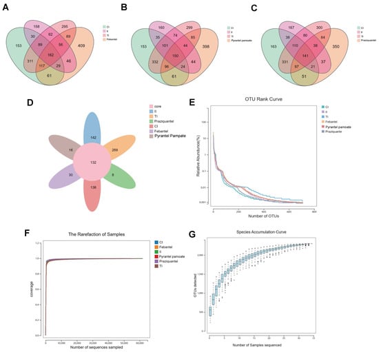 OUT statistical analysis. (A–D) Venn diagram and core-pan OUT map of the unique and shared OTUs among the six groups. (E) Rank-Abundance curves. (F) Rarefaction Curve Analysis. (G) Species accumulation curve. The horizontal coordinate represents the number of sequencing samples, and the vertical coordinate represents the number of OTUs. CI, intestine samples of dogs in the control group; II, intestine samples of dogs in T. canis infected group; TI, intestine samples of dogs infected with T. canis after Drontal Plus® Tasty treatment group; Febantel, intestine samples of dogs infected with T. canis treated with Febantel; Praziquantel, intestine samples of dogs infected with T. canis treated with Praziquantel; PP, intestine samples of dogs infected with T. canis treated with Pyrantel pamoate.