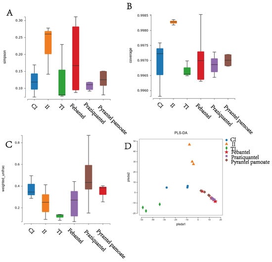 Beta diversity indicates the comparison of species presence, abundance and phylogenetic relationships among community members. In our study, the weighted unifrac index indicated that the species composition of intestinal microbiota was more stable compared the II group with the anthelmintic treatment groups. The effects of different anthelmintic treatment on intestinal microbiota were also different, but the difference was not obvious between the CI group and the anthelmintic treatment groups (Figure 2C). The result of PLS-DA analysis showed that the CI, II and TI groups formed different clusters, indicating that the sample grouping effect was well and the difference between groups was obvious. But the difference between the Febantel, Praziquantel, and PP groups were small and could not be distinguished well (Figure 2D). These results indicated that the three anthelmintic had certain similarities in their effects on intestinal microbiota.