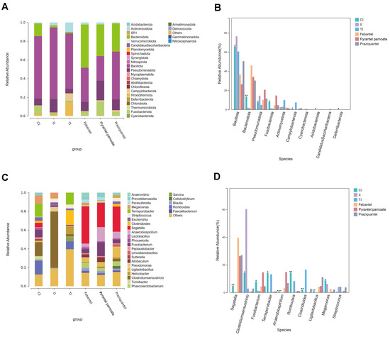 Meanwhile, in the Febantel, Praziquantel, and PP treatment groups, Bacteroidetes was also a kind of dominant microbiota. Some studies have shown that Bacteroidetes was decreased in patients with Blastocystis, Entamoeba histolytica, Toxoplasma infections [36]. Bacteroidetes also participates in regulating inflammatory processes. Our study revealed that T. canis infection significantly diminished the abundance of Bacteroidetes in the intestinal microbiota. Notably, the administration of Drontal Plus® Tasty did not exert a notable regulatory effect on reversing the reduction of Bacteroidetes induced by T. canis infection. In contrast, treatment with Febantel, Praziquantel, or PP individually led to a significant increase in the proportion of Bacteroidetes, with the values observed being significantly elevated compared to that in the control group (CI group). This indicated that the different anthelminth might exerted different regulatory effects on host’s intestinal microbiota.