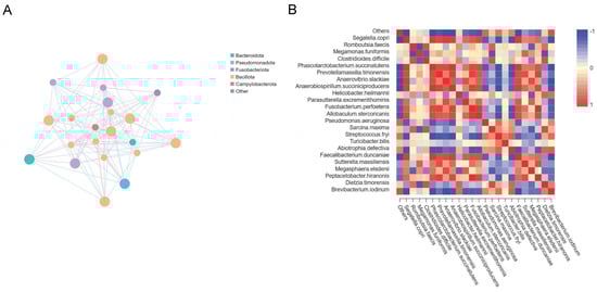 Correlation between microbiota. Correlation networks of microbiome on phylum showed in (A), each node in the graph represents a species, the larger the area of the point, it means that the average relative abundance of the species is higher; the species are connected to the species using straight lines, the pink color indicates a positive correlation, the blue color indicates a negative correlation, and the thickness of the lines indicate the correlation magnitude (the figure only shows the correlation coefficient between the species is more than 0.2). Heat map of correlation coefficient of microbiome on species was showed in (B). Darker colors indicating stronger correlation between species.