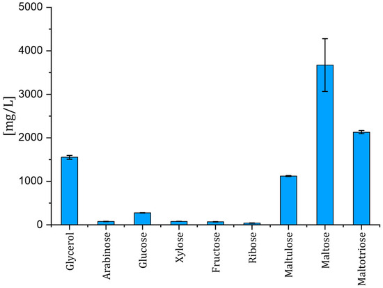 Composition of sugars in the utilized commercial lager beer from triplicates. Error bars indicate the standard deviation for each compound.