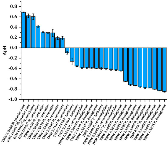 Change in pH in triplicates of lager beer spoiled by the respective strains’ initial lager beer pH of 4.3. Strains are sorted by the difference in pH compared with the control beer. A superscript T indicates the respective type strain, and error bars represent the standard deviation.