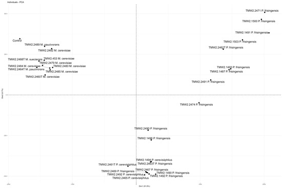 Principal component analysis of the residual carbohydrates in all samples spoiled by the strains as well as in the control beer revealing three main clusters. On the top left, all Megasphaera strains cluster in close proximity to the control beer, fortifying the marginal utilization of all carbohydrates by strains of the genus. The bottom cluster harbors most strains of the genus Pectinatus that show a significant but similar utilization of glycerol and maltose, whereas the P. frisingensis strains in the upper right corner show the highest degradation of maltose and therefore group as a separate cluster. All samples were biological triplicates that were incubated for 23 days at 30 °C, and the control was an unspoiled lager beer treated the same way as the spoiled samples.