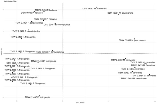 In order to distinguish the strains by considering all of their metabolized carbohydrates, a principal component analysis (PCA) was conducted on the residual carbohydrates of all strains (Figure 3).