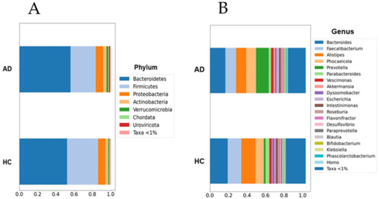 Barplots of microbial abundances at the phylum (A) and genus (B) levels. No significant differences were detected between groups. AD: Alzheimer’s disease; HC: healthy controls. Data are presented as percentages (0 to 1) of the mean relative abundances for each group.