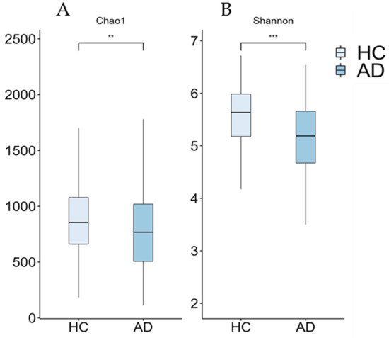 Boxplots of alpha-diversity measures (Chao1 (A) and Shannon (B) indices) from our cohort. Significant differences between groups are indicated by asterisks (** ≤0.01, *** ≤0.001). AD: Alzheimer’s disease; HC: healthy controls.