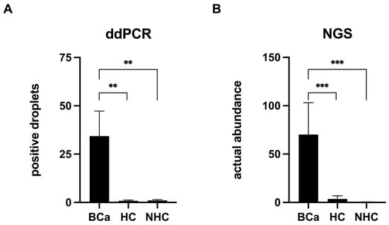 Porphyromonas somerae analysis with ddPCR and NGS. The mean of droplets positive for P. somerae identified with ddPCR (A) and actual abundance of P. somerae obtained by NGS analysis (B) were represented. Comparison analysis between the three groups (100 samples from ddPCR dataset: 35 BCa, 24 HC, 41 NHC; 64 samples from NGS dataset: 25 BCa, 24 HC, 17 NHC) revealed a statistically significant difference both for ddPCR (p = 0.003) and NGS (p < 0.0001). Pairwise comparisons confirmed significant differences between BCa and HC (ddPCR, q = 0.008; NGS, q < 0.0001) and BCa vs. NHC (ddPCR, q = 0.0014; NGS, q < 0.0001). BCa: bladder cancer group; HC: healthy control non-oncological group; NHC: non-healthy control group with prostate cancer. Data are shown as mean and standard error of mean. ** q < 0.01; *** q < 0.0001.