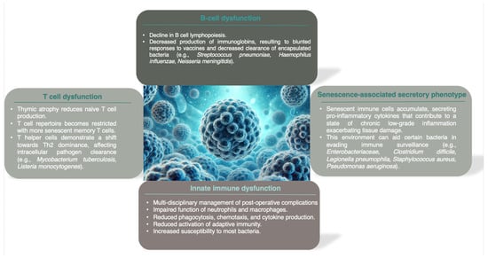 | B cell dysfunction | Age-related decline in B cell lymphopoiesis, altered signal transduction, and decreased production of high-affinity antibodies, affecting both vaccine responses and susceptibility to infections. | Encapsulated bacteria (e.g., S. pneumoniae, H. influenzae, N. meningitidis) | [13,14,15,18] |