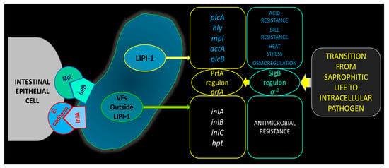 The critical virulence genes/virulence factors of Listeria monocitogenes facilitate its transformation from a saprophyte to a potent pathogen, allowing it to efficiently invade host cells. Abbreviations: LIPI-1—Listeria pathogenicity island 1; PrfA—positive regulatory factor A; SigB—Stress-responsive sigma factor σB; plcA—phospholipase A; plcB—phospholipase B; actA—actin assembly-inducing protein; hly—listeriolysin O; mpl—metalloprotease; inlA—Internalin A; inlB—internalin B; inlC—Internalin C; hpt—hexose phosphate transporter.