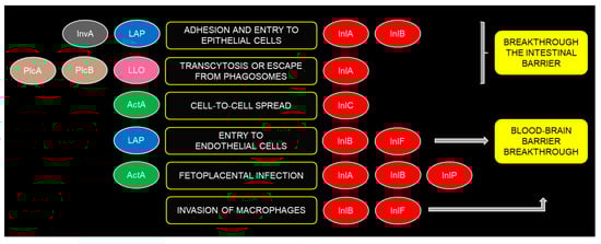 The expression of each disease symptom depends on the VFs present in Listeria, the host’s immune status, and the bacterial load ingested. Internalins (InlA and InlB), invasins (invasin A, LAP—Listeria adhesion protein), and surface adhesion proteins (InlP1, InlP4) are responsible for binding to epithelial cells, while internalin C and actin-inducing protein (ActA) are involved in cell-to-cell spread [37]. InlB is identified as the ligand of secreted LAP on the LM cell surface, and LAP-InlB interplay promotes LM systemic spread, including brain invasion [38]. In eukaryotic cells, LM is at first transiently trapped in a primary vacuole from which it escapes prior to phagolysosomal fusion through membrane pores formed by listeriolysin O (LLO) and is further facilitated by the following two phospholipases: PlcA and PlcB [11]. The actin assembly-inducing protein (ActA) promotes intracellular bacterial motility and facilitates cell-to-cell spread by polymerizing actin from the host cytoskeleton [11,44,45,46] (Figure 2). Rapid switching of gene expression pathways and protein synthesis is a strategy for Listeria to adapt quickly to the host’s dynamic environment [47].