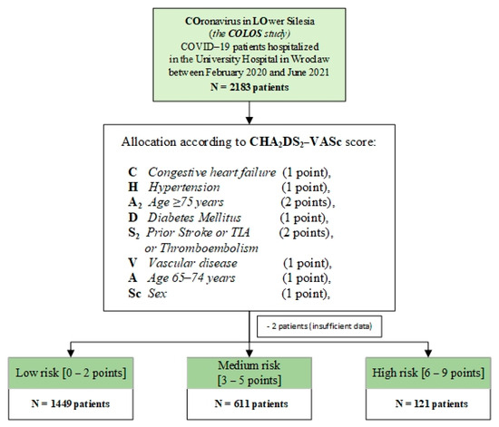 In the current study, a retrospective analysis of 2183 patients with COVID-19 hospitalized at the COVID-19 Centre of the University Hospital in Wrocław, Poland, between February 2020 and June 2021, was performed. In all patients, rigorously following the protocol published by the World Health Organization (WHO), SARS-CoV-2 infection was confirmed by reverse transcription–polymerase chain reaction (RT-PCR) in nasopharyngeal swabs. All medical records were collected as part of the COronavirus in LOwer Silesia—the COLOS registry project. All studies were conducted in accordance with relevant guidelines and regulations. The study protocol has been accepted by the Institutional Review Board and Ethics Committee at the Wroclaw Medical University, Wroclaw, Poland (No. KB-444/2021). Informed consent was obtained from all study participants. All available medical data were fully anonymized and then analyzed retrospectively. The CHA2DS2-VASc score was calculated according to the following variables: congestive heart failure (1 point), hypertension (1 point), age ≥ 75 years (2 points), diabetes mellitus (1 point), prior stroke or TIA or thromboembolism (2 points), vascular disease (1 point), age 65–74 years (1 point), and sex (1 point). Diabetes mellitus was diagnosed according to the criteria of the American and Polish Diabetes Societies. The data reviewed were based on demographic information, clinical characteristics, mechanical ventilation, smoking, comorbidities, previous medications, laboratory results, and hospitalization history. Based on the calculated score, subjects were assigned to one of three groups—low risk, 0 to 2 points; intermediate risk, 3 to 5 points; and high risk, 6 to 9 points. Figure 1 shows the study protocol.